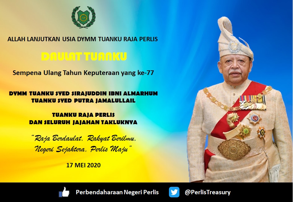 The Raja of Perlis Tuanku Syed Sirajuddin was born in Arau Perlis on May 17th 1943 The Perlis State Government has determined that the date of the Perlis Kings Birthday Anniversary is amended from May 17th to July 17th from 2018 to 2021. 13122020 Raja Perlis Tuanku Syed Sirajuddin Jamalullail menitah nasihatkan agar Jawatankuasa Fatwa Negeri Perlis terus beriltizam dengan semangat muafakat untuk memberi sumbangan ke arah memajukan pemikiran meluruskan pemahaman meneguhkan pegangan menyebarkan dan mengangkat syiar Islam di bumi Perlis ini. According to the state constitution the Raja of Perlis shall first appoint.