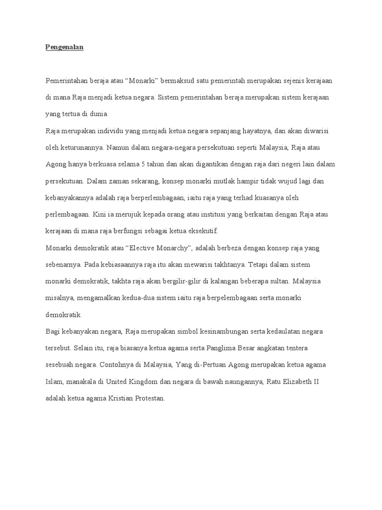 Sistem pemerintahan beraja atau Monarki bermaksud Raja menjadi ketua negaradan menberikan kuasa-kuasa dan hak-hak tertentu. Revolusi dan evolusi bernegara pada zaman moden pasca Perang Dunia Pertama telah merubah bukan sahaja persempadanan malahan pola pemikiran manusia dengan berteraskan. 07012010 Sistem Pemerintahan Beraja Melayu Di Alam Melayu sistem pemerintahan berajanya merupakan campuran sistem tempatan dengan pengaruh Hindu dan Buddha.